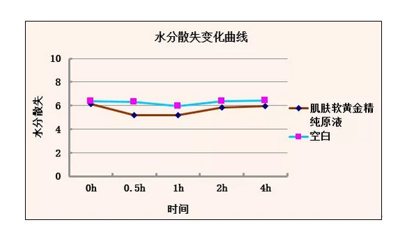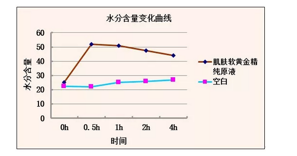 涂抹肌膚軟黃金精純原液后,皮膚水分含量開始增加,當涂抹0.5小時后,皮膚水分含量達到最大狀態(tài)。隨后處于正常溫濕度環(huán)境下,皮膚表層水分開始散失。使用4小時后,精純原液涂抹區(qū)域比空白區(qū)域還要高出20個百分點,表明本款產(chǎn)品具有一定的補水功效。