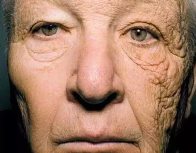 圖片中的這位老人右邊的臉因?yàn)楣ぷ髟?,常年受到紫外線的照射,結(jié)果很明顯,右邊的臉明顯比左邊的臉老化太多!
